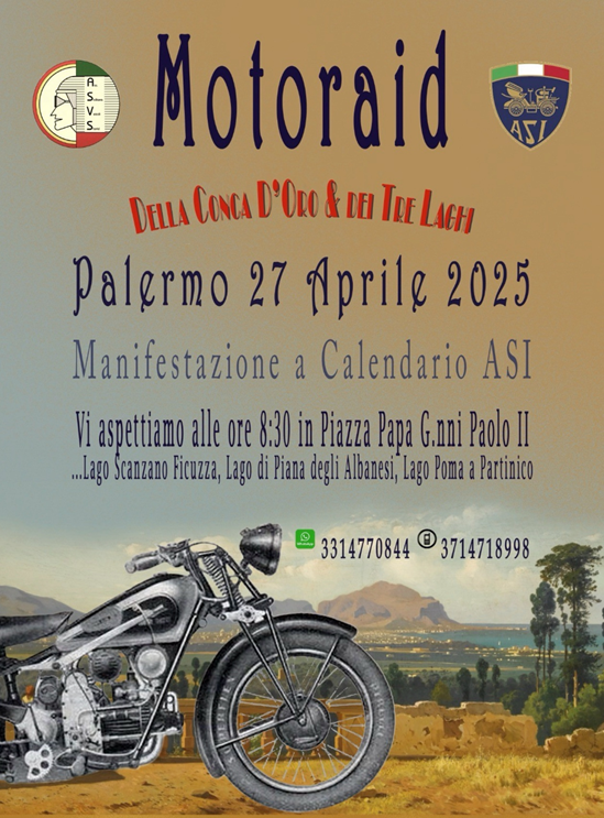 Motoraid della Conca d’Oro e Dei Tre Laghi – Palermo 27 Aprile 2025 Manifestazione a Calendario ASI Vi aspettiamo alle ore 8:30 in Piazza Papa G.nni Paolo II Ore Programma…